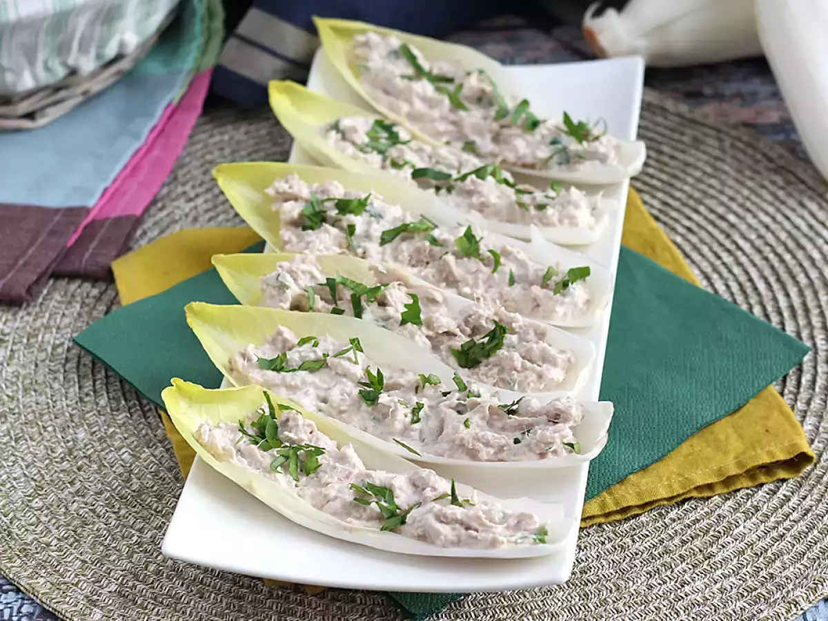 За бърз аперитив без готвене опитайте тези подноси с ендивия! За пълнежа смесете малко риба тон, дребни сусамки, магданоз и... това е всичко! Казахме ви, че се приготвя бързо ;-) Поставете плънката върху листа от ендивия, за да изглежда свежа.
