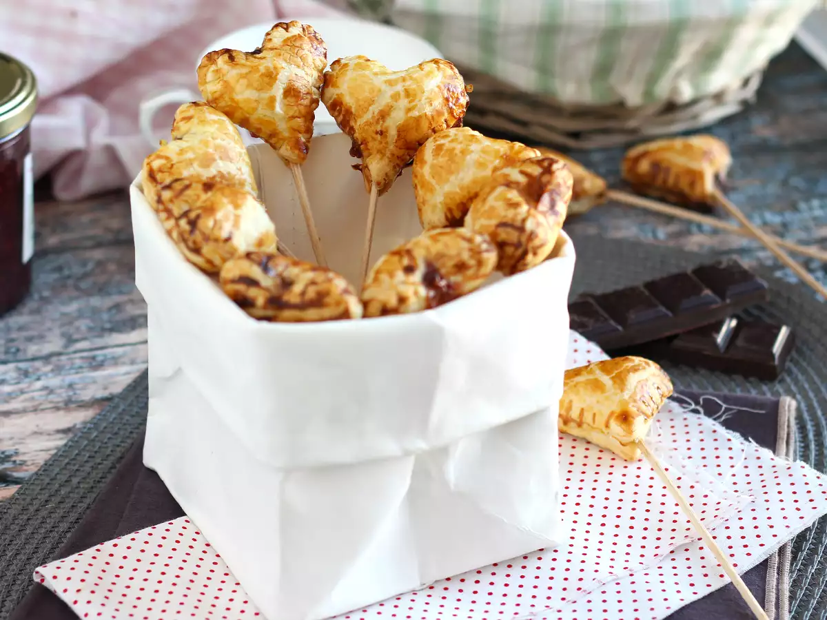 Сладка закуска с тези сърца от бутер тесто, представени като близалки. Вътре има малиново сладко и нарязан шоколад, които съчетават два неустоими вкуса. Чудесна идея да покажете на половинката си, на семейството си или на приятелите си, че ги обичате с рецепта ♥